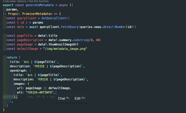 generateMetadata를 활용해 뉴스 해당 뉴스 상세데이터를 호출 제목과 이미지를 정리하여 동적으로 넣어준다.
